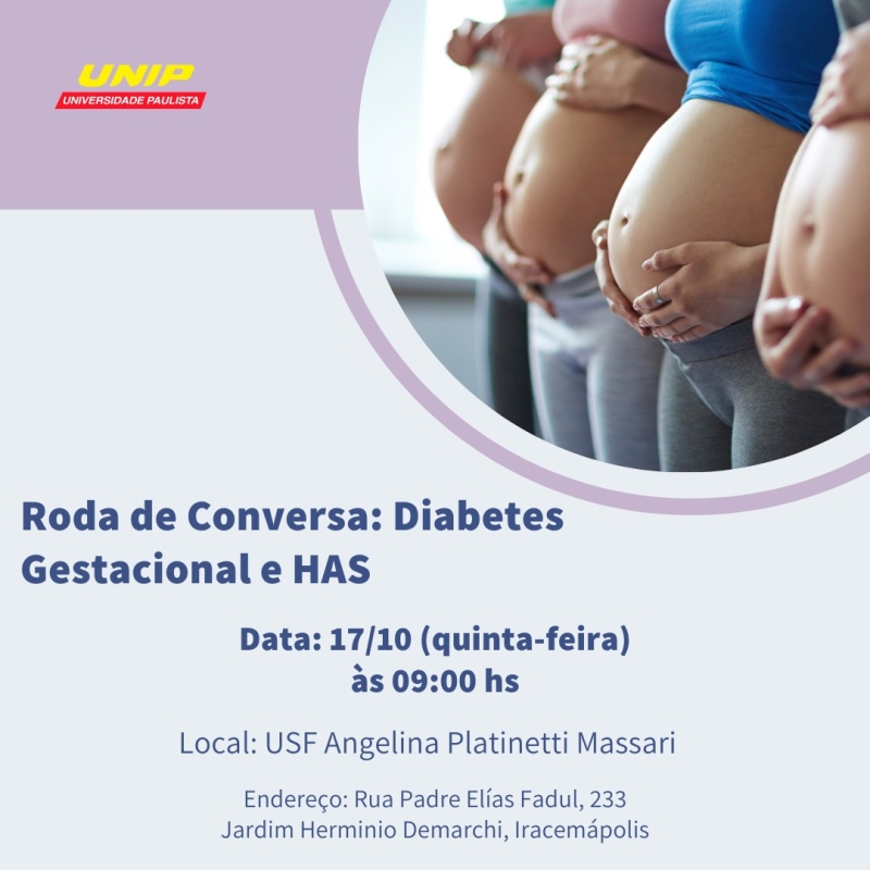No dia 17/10/2024 (quinta-feira) às 9:00 horas na USF Angelina Platinetti Massari (Jardim Iracema) haverá uma Roda de Conversa com as Estagiárias da UNIP com o tema: Diabetes Gestacional e HAS.