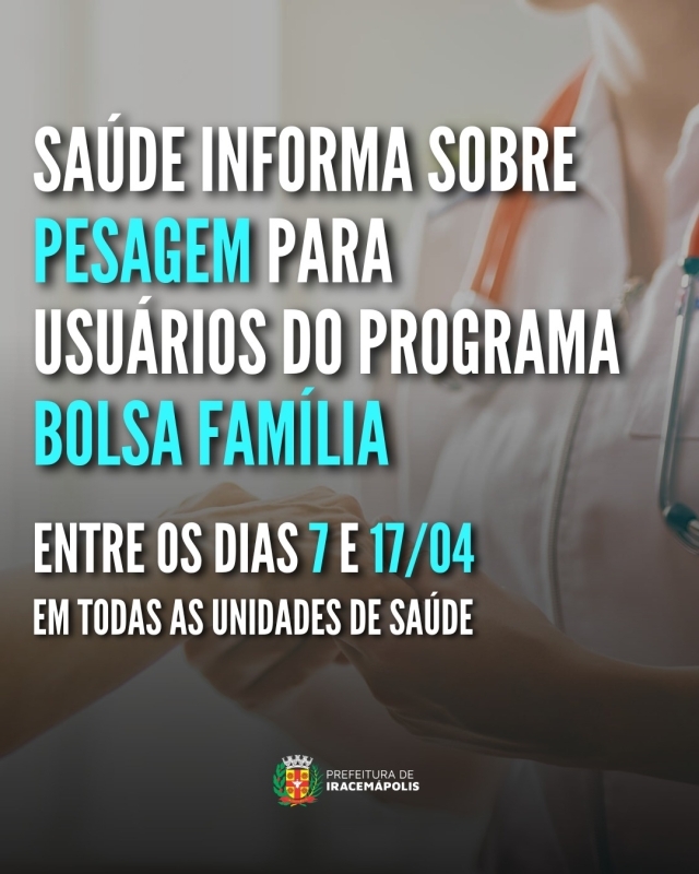 O Departamento Saúde inicia na próxima semana a pesagem dos usuários do bolsa família. A iniciativa acontece em todas as unidades de saúde do município entre os dias 7 e 17 de abril, das 8h as 15h.